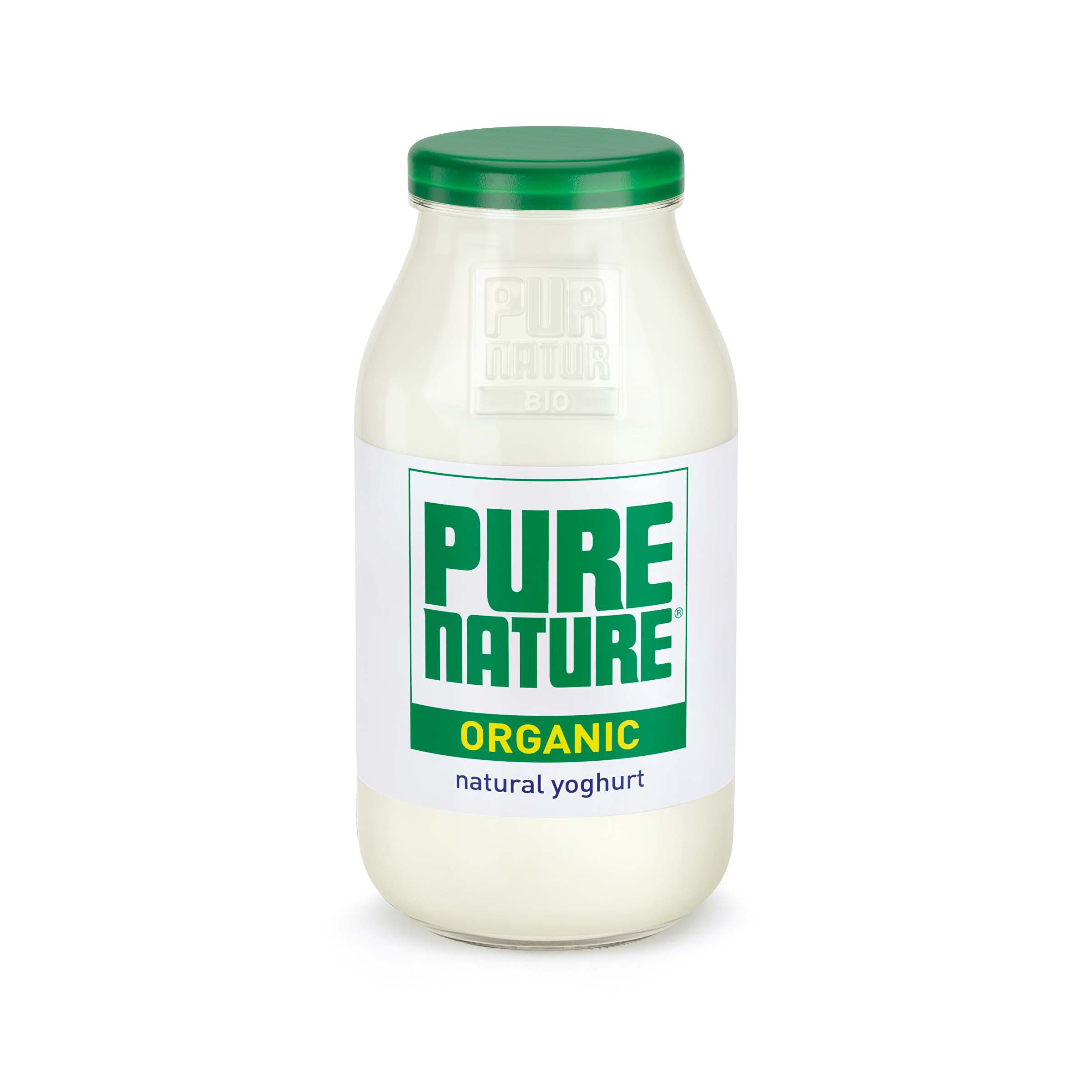 Organic full-fat stirred yoghurt in a resealable 500g glass jar.